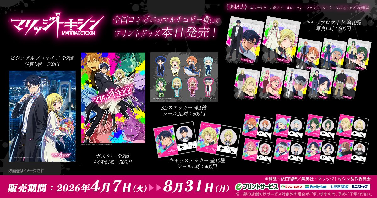 コンビニのコピー機で「TVアニメ『マリッジトキシン』プリントグッズ」が2026年4月7日(火)から販売が開始されています。販売期間は8月31日(月)まで。