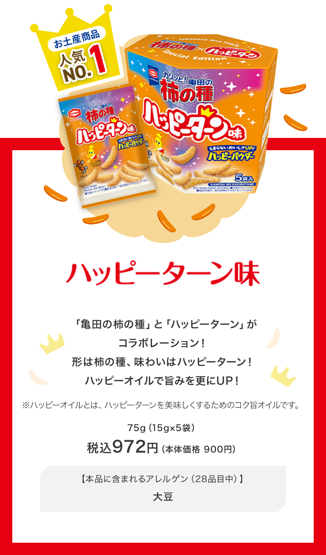 亀田の柿の種の味わいを楽しめる「ハッピーターン」と、ハッピーターンの味わいを楽しめる「亀田の柿の種 ピーナッツなし」とされています。