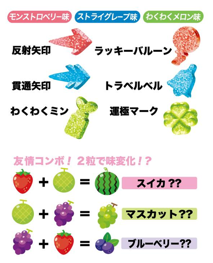 また各フレーバーを組み合わせて2粒一緒に噛みしめると、「ストロベリー×メロン」で『スイカ味??』、「メロン×グレープ」で『マスカット味??』、「グレープ×ストロベリー」で『ブルーベリー味??”』、“友情コンボ”で新たなフレーバーに進化!?するそうです。