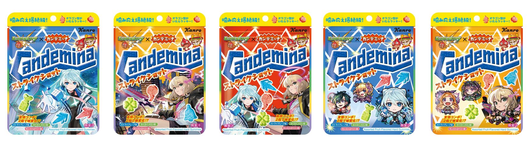 「カンデミーナグミ ストライクショット」のパッケージデザインは全5種類が用意され、2025年7月に獣神化・改した「ネオ」や、2025年の新春キャラとして登場し「エル」などが登場。