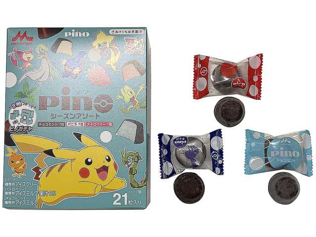 「ピノ シーズンアソート(ポケモンパッケージ)」は、ポケモン達がパッケージにデザインされ、バニラ・ストロベリー・チョコミントの3種類のフレーバーを楽しめるボックスタイプのアソートアイス。