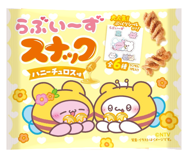 ぷっくりシールは全6種類が用意され、いずれか1種類がランダムで封入。またお菓子は「らぶいーず」の可愛らしい世界観に合わせ、ハニーチュロスをイメージして開発したオリジナル商品とされています。