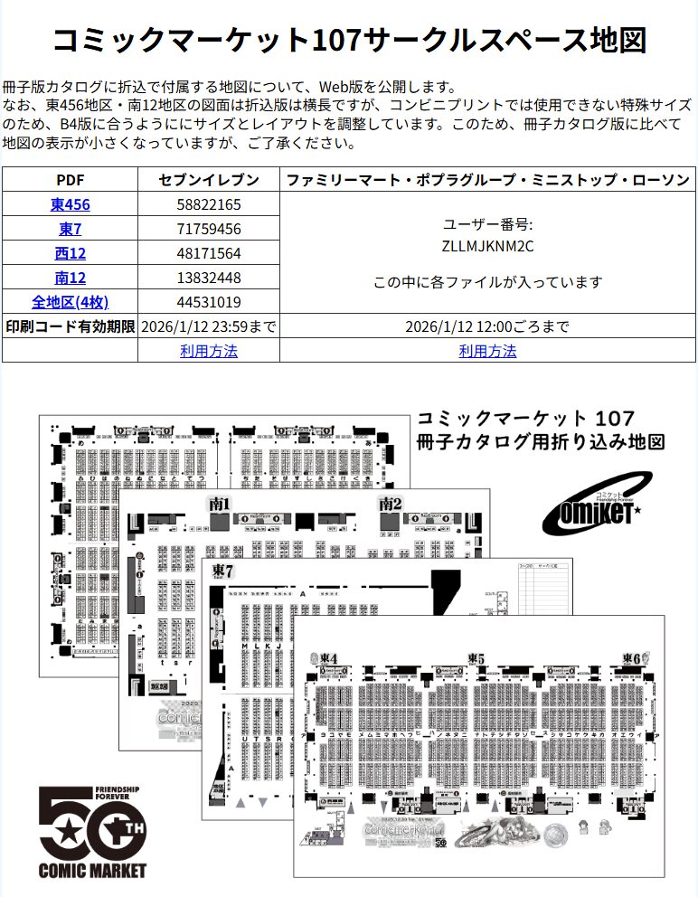 2025年8月16日(土)/17日(日)に東京ビッグサイトで開催される同人誌即売会「コミックマーケット106」(コミケ106/冬コミ)の『サークルスペース地図』(配置図マップ)が、コンビニに設置されているマルチコピー機で印刷可能になっています。