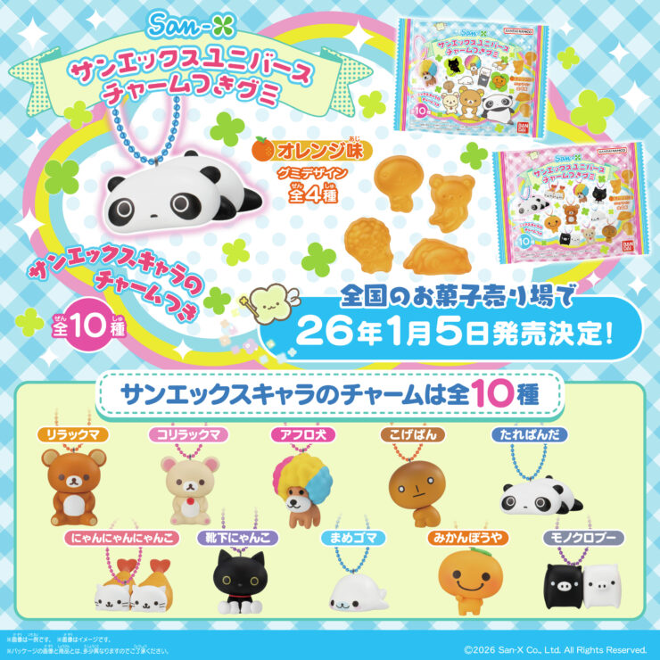 たれぱんだやリラックマなど、「サンエックス」のキャラクターが可愛らしいマスコットチャーム&グミになって登場