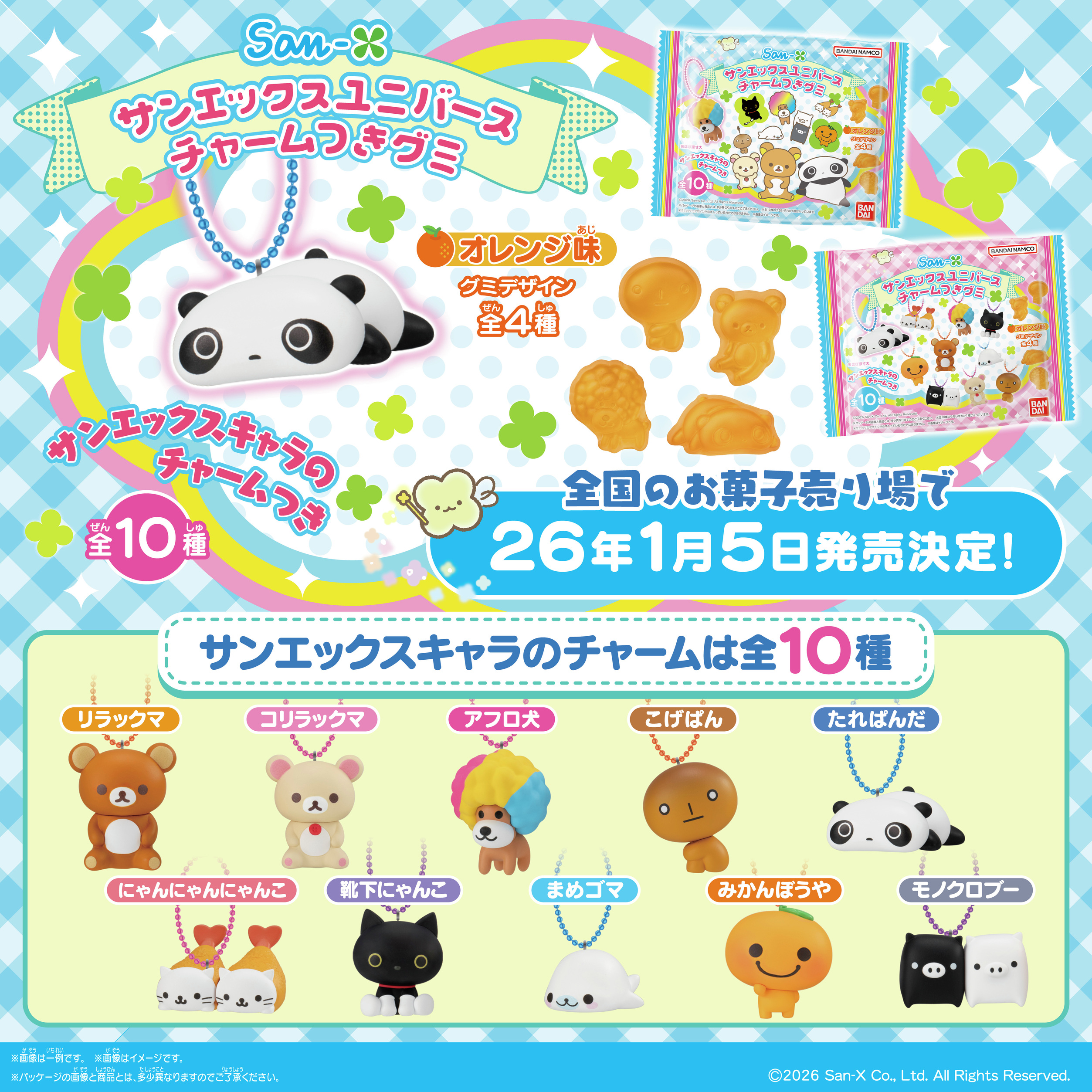 バンダイキャンディの「サンエックスユニバース チャームつきグミ」が全国量販店のお菓子売り場などで2026年1月5日(月)に発売が予定されています。価格は385円(税込)。
