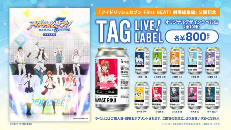 「アイドリッシュセブン First BEAT! 劇場総集編 オリジナルデザインラベル缶<< TAG LIVE! LABEL >>」が、ローソン・ユナイテッドシネマ グループの一部映画館で2025年10月3日(金)から販売が開始されます。デザインは10種類で、価格は各800円(税込)。
