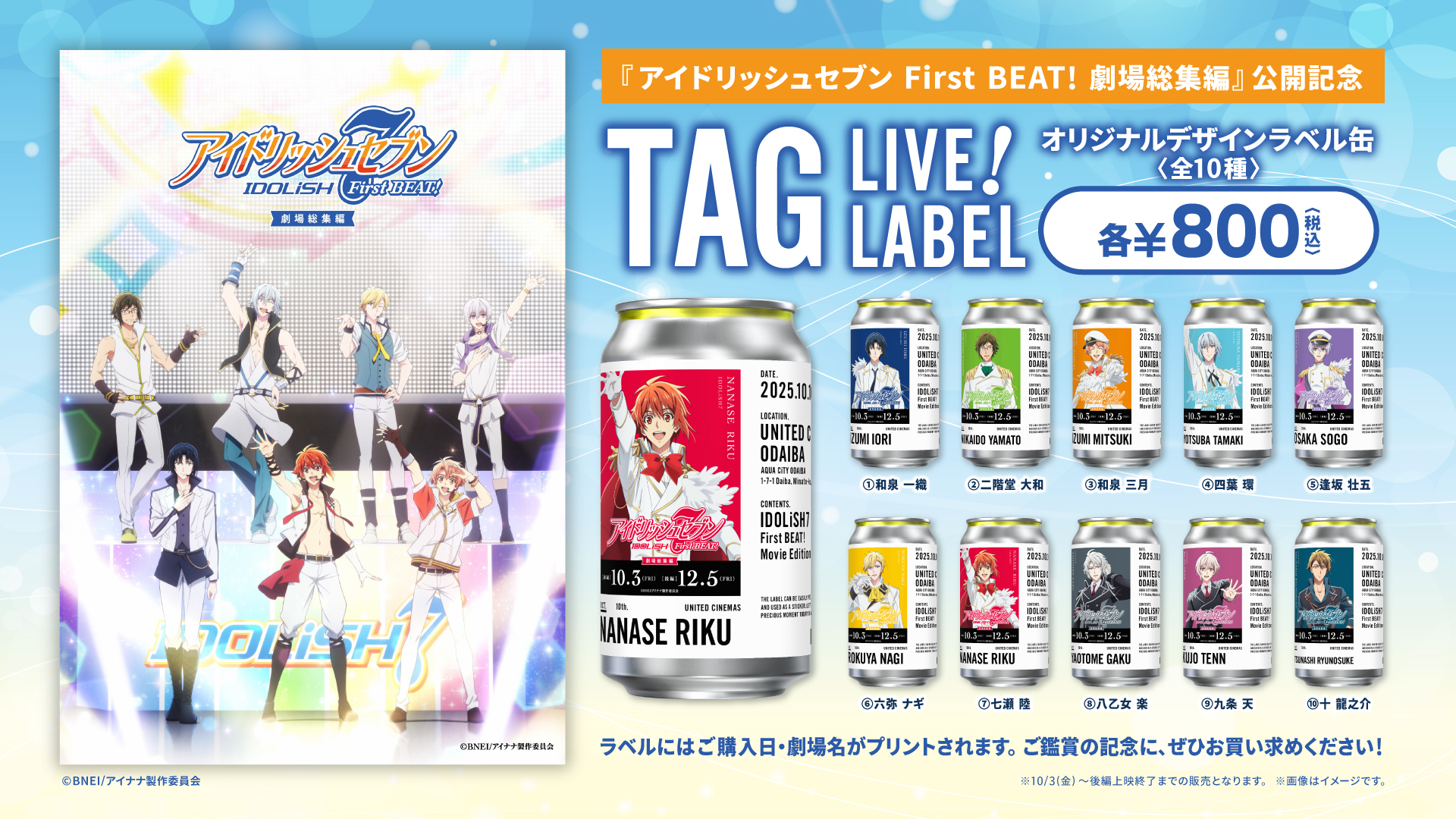 アイドリッシュセブン First BEAT! 劇場総集編 オリジナルデザインラベル缶<< TAG LIVE! LABEL >>」はローソン・ユナイテッドシネマの一部映画館で10月3日(金) 劇場オープン時間から販売され、取り扱い劇場は豊橋18、豊洲、前橋、浦和、水戸、アクアシティお台場とされています。