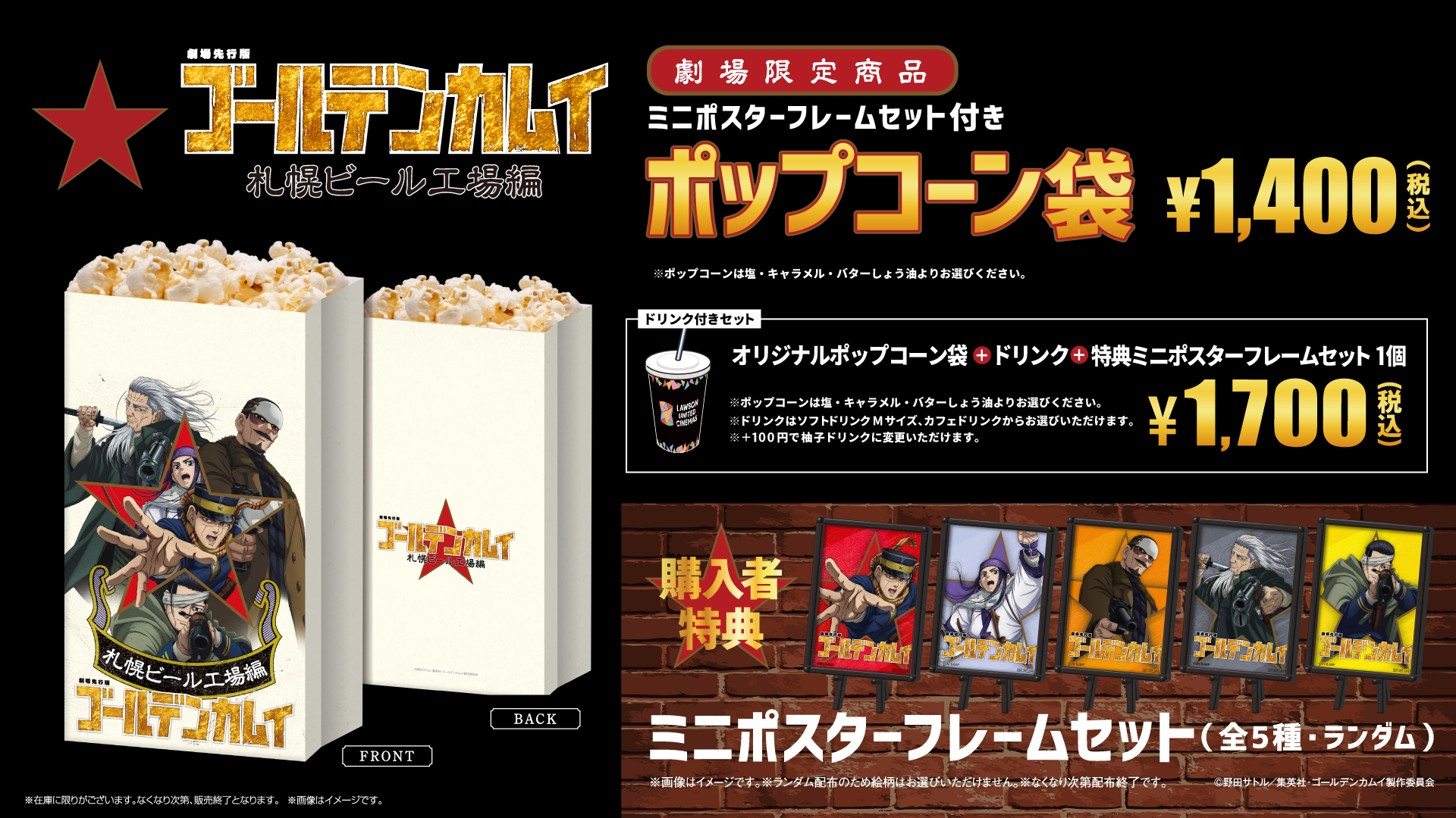 劇場先行版アニメ『ゴールデンカムイ 札幌ビール工場編』ミニポスターフレーム付きポップコーン袋が一部映画館で2025年10月10日発売、杉元やアシㇼパたち全5種の中からランダムで1個配布。ユナイテッドシネマ としまえんなど一部上映劇場にて取り扱い