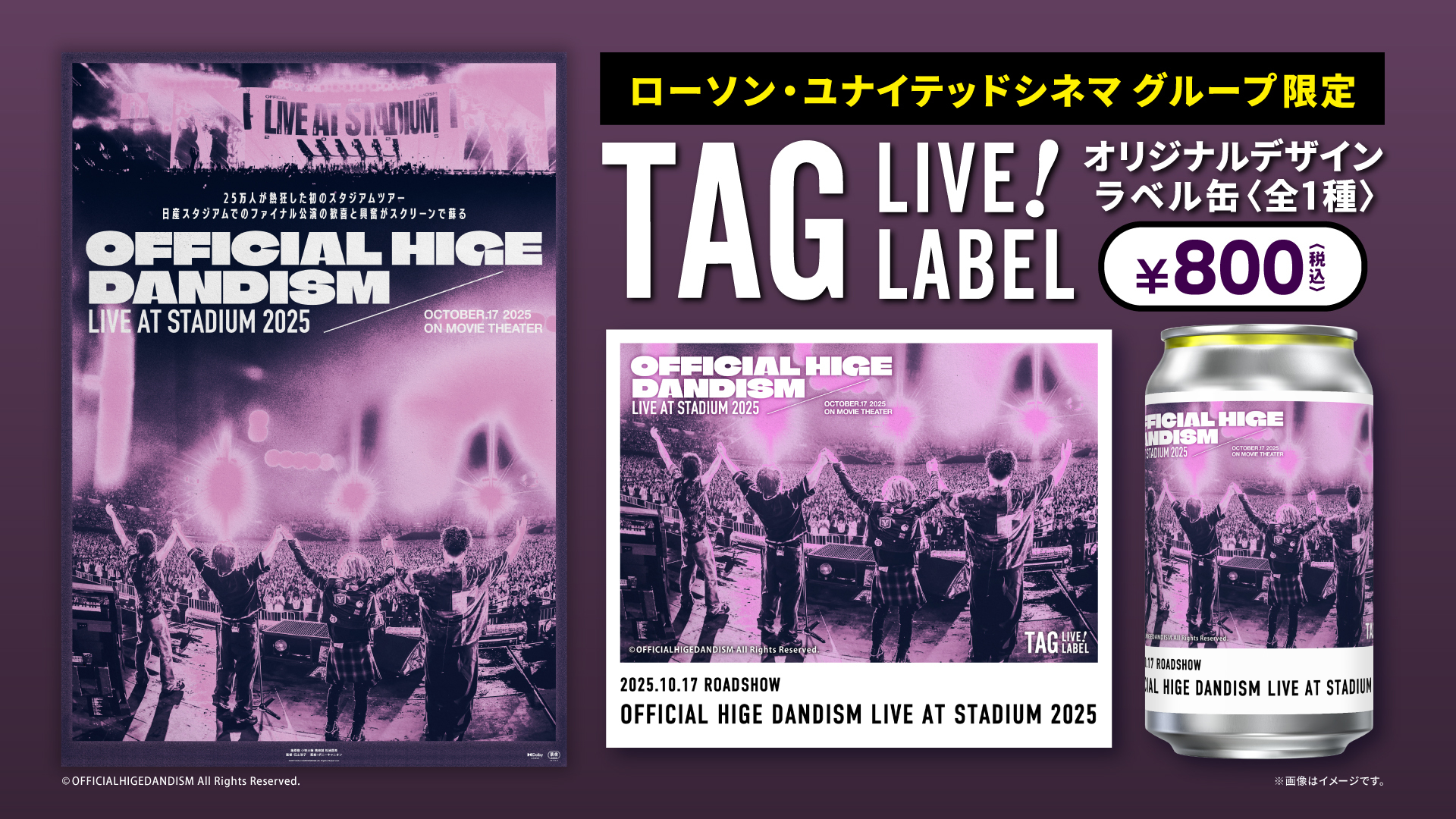 「劇場版OFFICIAL HIGE DANDISM LIVE at STADIUM 2025 オリジナルデザインラベル缶<< TAG LIVE! LABEL >>」はローソン・ユナイテッドシネマの一部映画館で10月17日(金) 劇場オープン時間から販売され、取り扱い劇場は札幌、浦和、アクアシティお台場、豊橋18とされています。