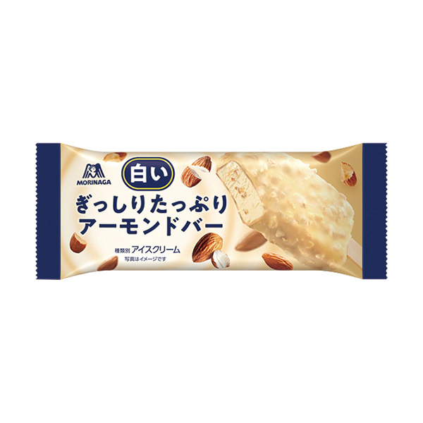 森永製菓「白いぎっしりたっぷりアーモンドバー」は、アーモンドが混ぜ込まれたバニラアイスを、ローストアーモンド入りのホワイトチョコでコーティングしたというバーアイス。