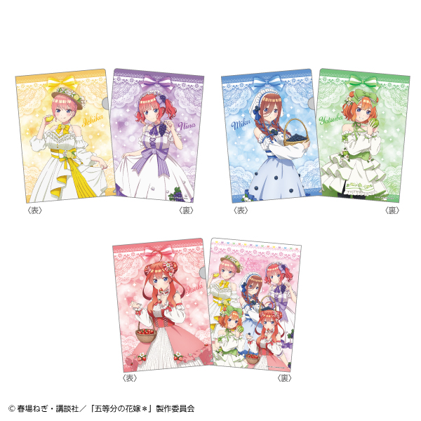 中野一花、中野二乃、中野三玖、中野四葉、中野五月の5人がフルーツドレス姿で登場し、アクリルスタンドは全5種類、缶バッジは全5種類(ランダム)、クリアファイル3枚セットは全1種類がラインアップされています。