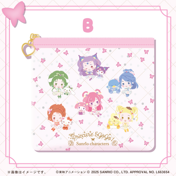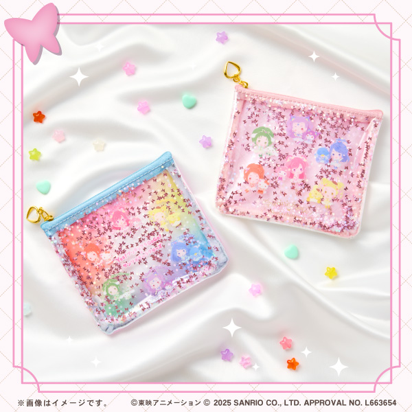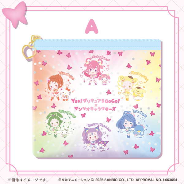 「キュアドリーム&マイメロディ」、「キュアルージュ&ハローキティ」、「キュアレモネード&ポムポムプリン」、「キュアミント&シナモロール」、「キュアアクア&タキシードサム」、「ミルキィローズ&クロミ」がペアで登場し、アクスタは全6種(ランダム)、ポーチは全2種ラインアップされます。