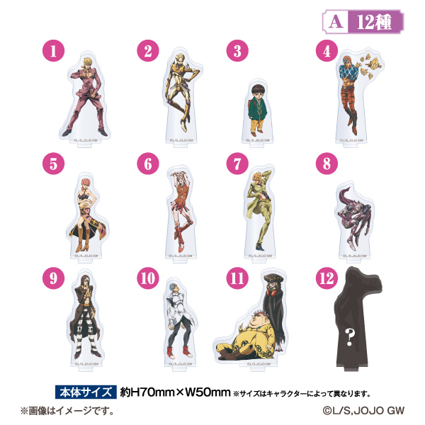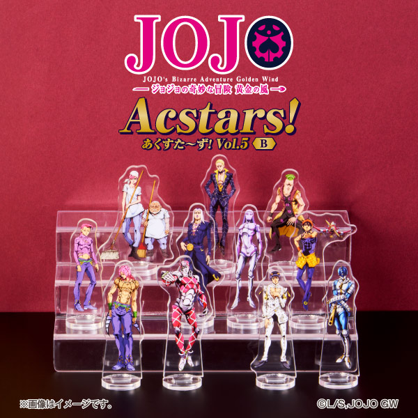 「ジョジョの奇妙な冒険 あくすた~ず! 第5弾」は、持ち運びしやすいサイズのミニチュアアクリルスタンド「あくすた~ず!」シリーズの『ジョジョの奇妙な冒険 第5部 黄金の風』バージョン。