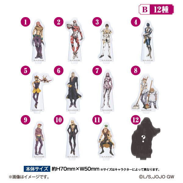 ジョジョ第5部『黄金の風』に登場するキャラクターやスタンドがミニアクスタになって登場し、ジョルノやゴールド・エクスペリエンス、ブチャラティ、トリッシュ、ミスタ、ならん茶、アバッキオ、ディアボロ、キング・クリムゾンたちがミニアクスタで登場。