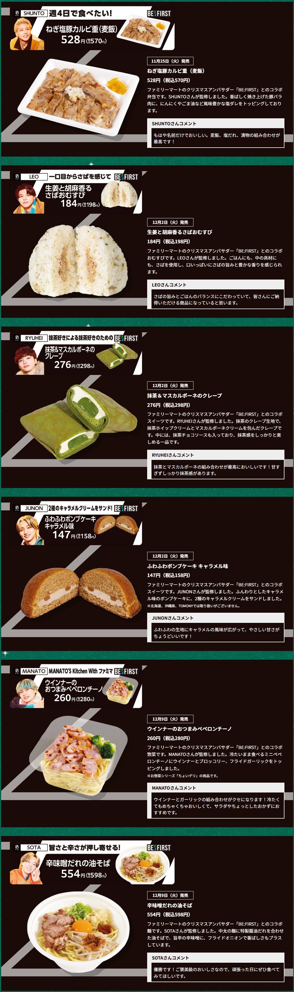 メンバーそれぞれをイメージし、「BE:FIRST」メンバーと一緒に選んだ商品とされ、スイーツからガッツリ系まで、グループの魅力を感じられる商品に仕上がったそうです。