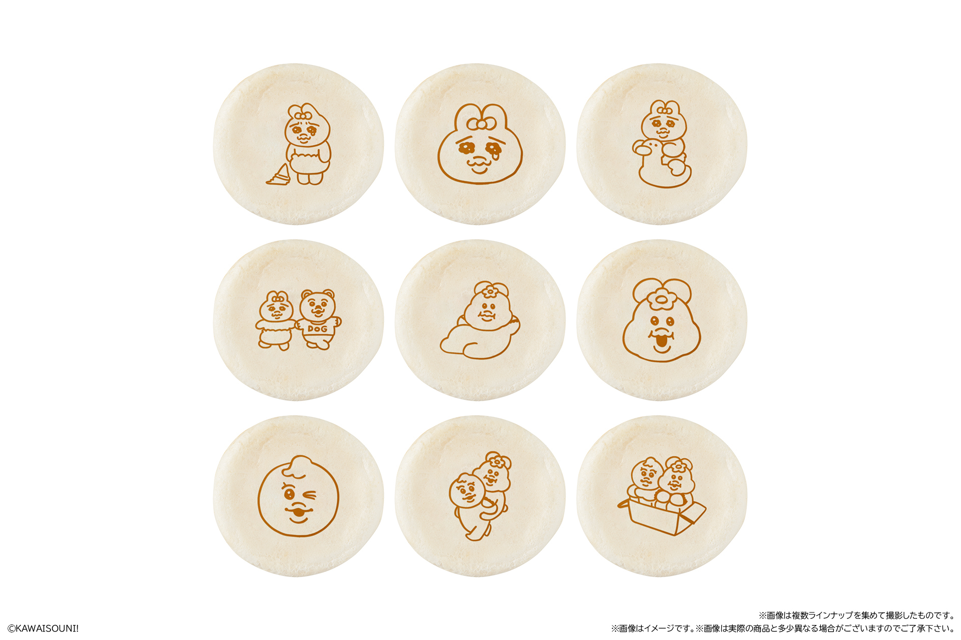 まんまる生地の今川焼きの中にミルク味のクリームが詰まっており、生地の表面には“おぱんちゅうさぎ”や“んぽちゃむ”達の可愛い表情やポーズの焼き印が押されています。焼き印のデザインは全9種類。