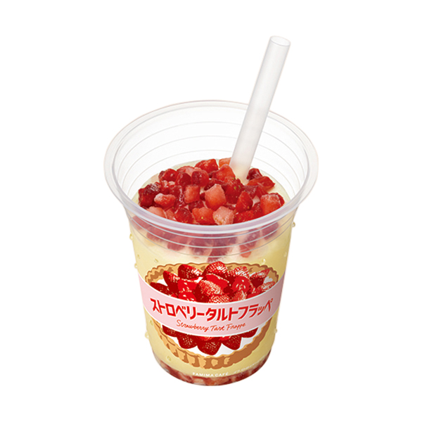 「ストロベリータルトフラッペ」は、ストロベリータルトの味わいをイメージし、いちごの果肉感と甘酸っぱさ、カスタード風味のやさしい甘さとクッキーの香ばしさを楽しめるというフラッペ。