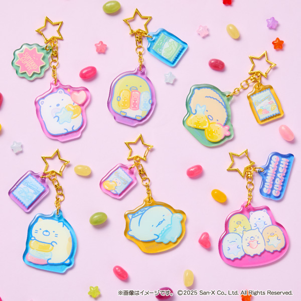 今回販売される『すみっコぐらし』の新作グッズは、2025年12月から展開されるすみっコぐらしのテーマ『グミグミパーティー』アートを使用したアクリルキーホルダー。価格は880円(税込)。