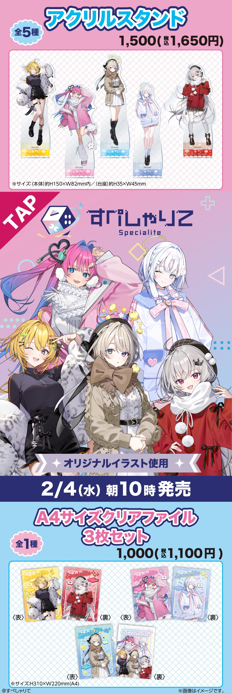 今回、ファミマで販売される「すぺしゃりて」グッズは、小鳥谷なのさん達5名のオリジナルイラストを使用した「アクリルスタンド」「A4サイズクリアファイル 3枚セット」の2商品。