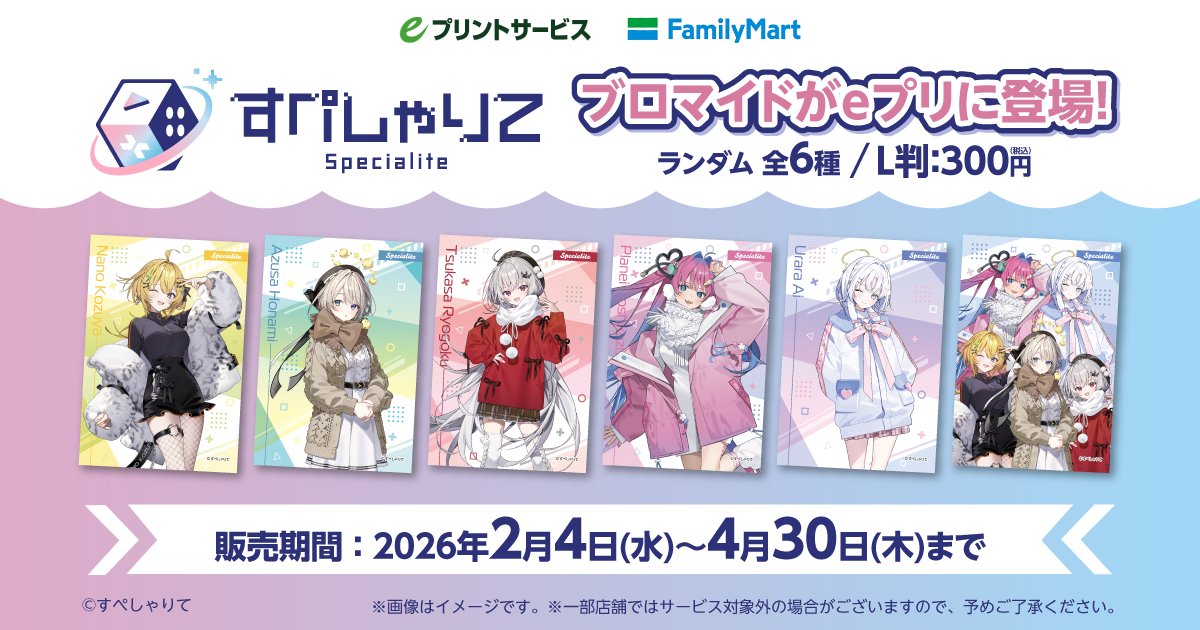 その一環で、「すぺしゃりて eプリント ランダムブロマイド」がファミリーマートで2026年2月4日(水)から販売が開始されます。販売期間は4月30日(木)まで。
