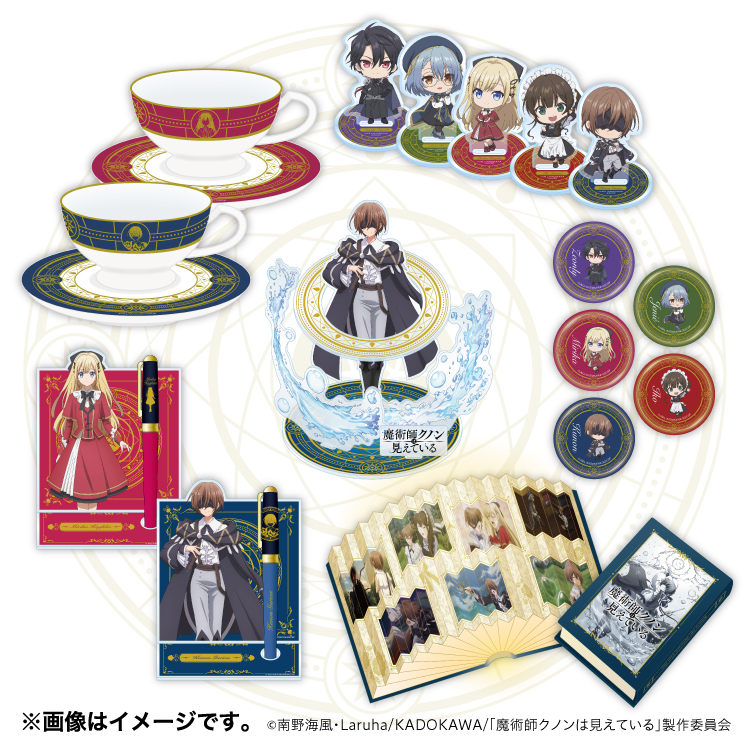 賞品ラインアップはA賞~E賞とラスト賞が用意され、A賞は奥行きの異なるアクリルを重ねることで魔術エフェクトを立体的に見せたクノンの「魔術発動! 3次元アクリルスタンド」、B賞は魔法陣の輝きを思わせる上品なデザインとクノン / ミリカがそれぞれデザインされた「優雅なひととき! カップ&ソーサー」、C賞はクノン / ミリカデザインのペンスタンドと万年筆がセットになった「文字が躍る! 万年筆&アクリルペンスタンド」となっています。