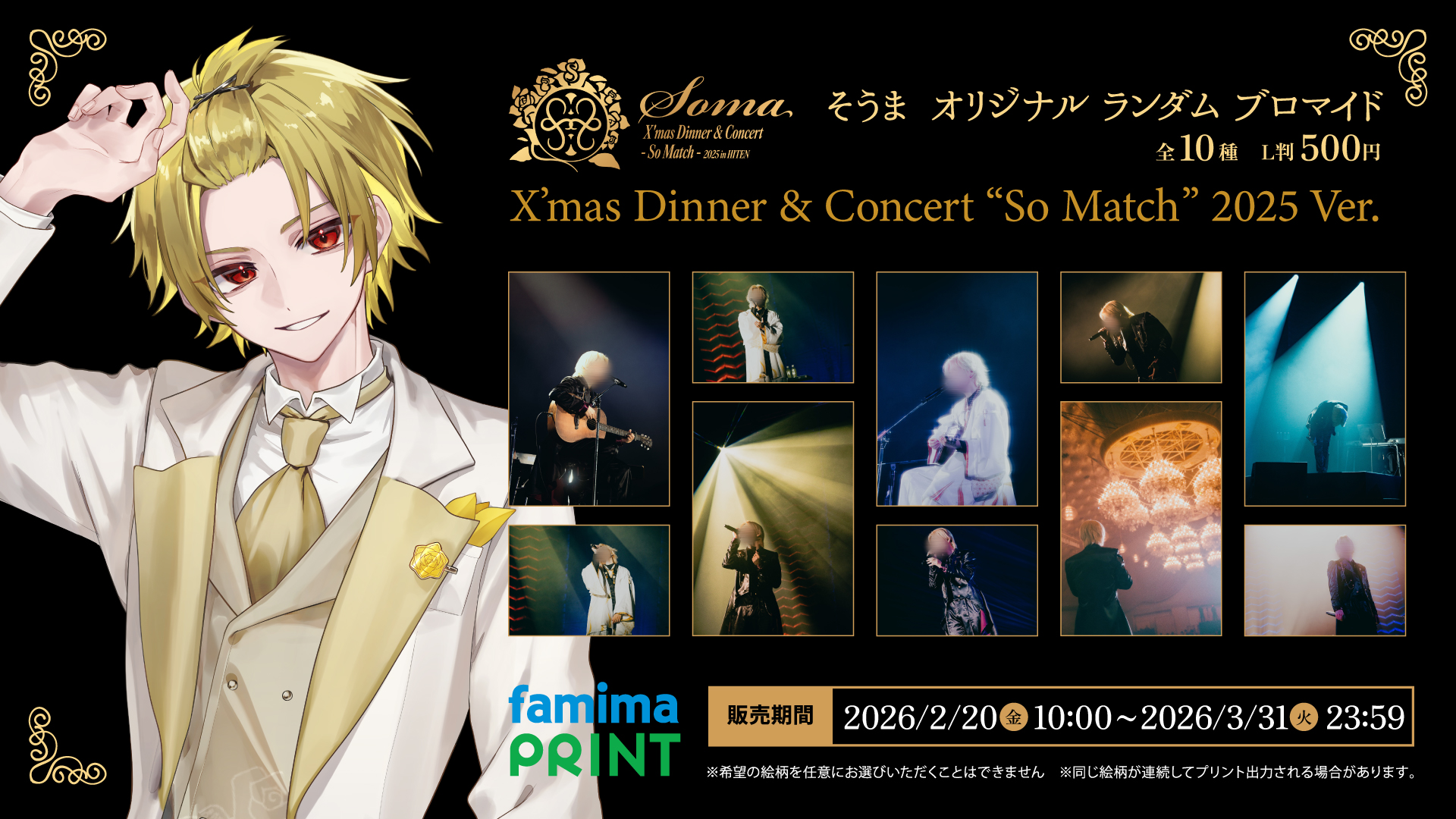 歌い手のそうまさんの「実写」ブロマイドは第1弾が2025年9月に登場し、今回、待望の第2弾が登場。第2弾は「X’mas Dinner & Concert “So Match”2025 Ver.」の全10種類がラインアップされ、全10種の中からいずれか1種がランダムでプリントアウトされます(購入前にデザインを選ぶことは不可)。