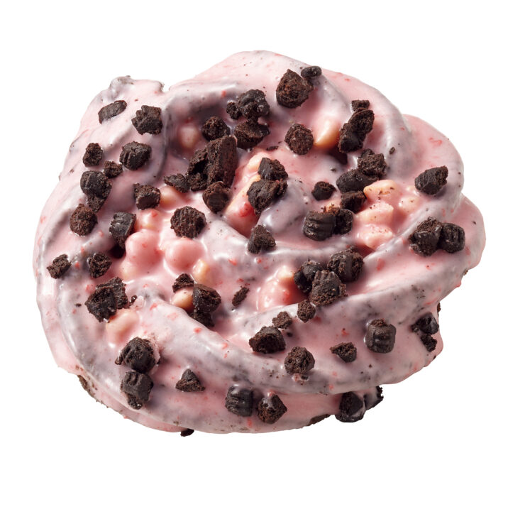 北海道牛乳を使用したザクザクとした食感のクッキードーナツに、バタービスケット、いちごチョココーティング、ココアビスケットをトッピングしたというドーナツ。