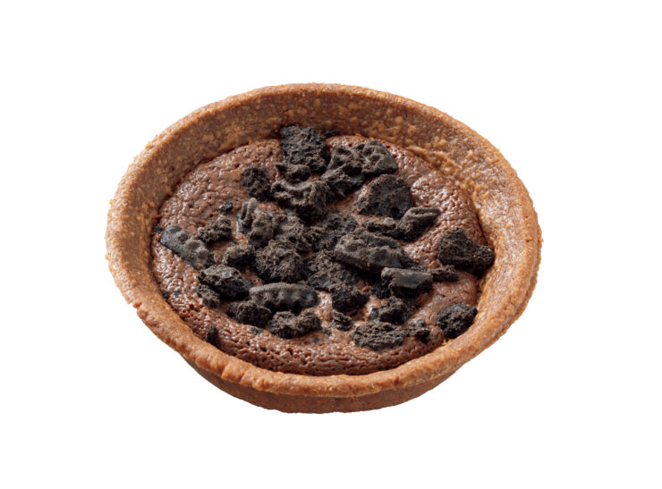 ココアタルトに、チョコチップとチョコ生地を入れ、ココアビスケットをトッピングし、焼き上げることで、ザクサク食感に仕上げたそうです。