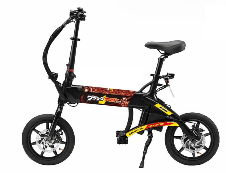 16歳以上なら免許不要で運転できるという電動サイクルで、ブラックサンダーのデザインが施されたファミマオンライン限定モデルとされています。