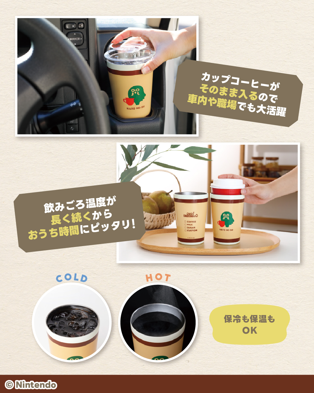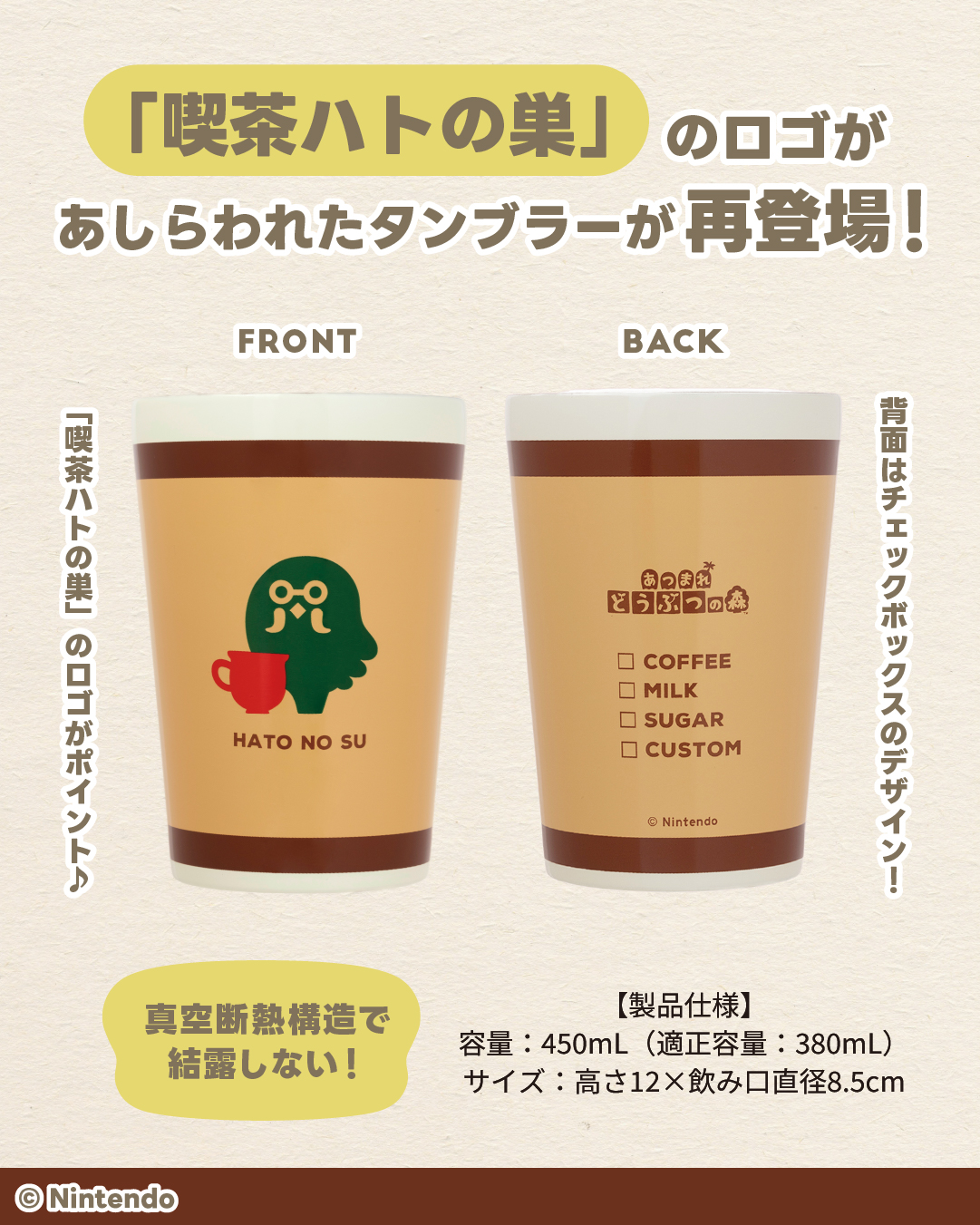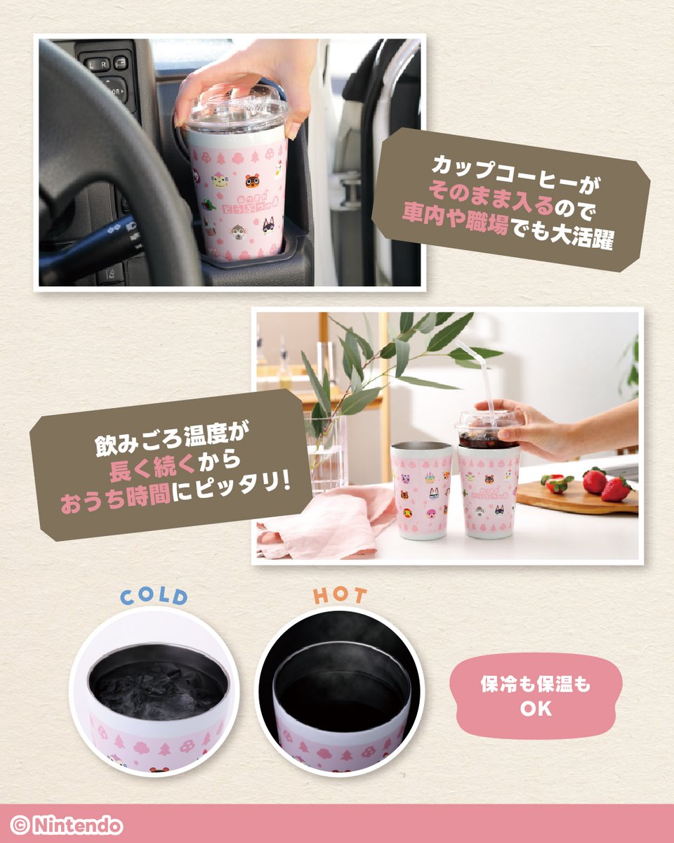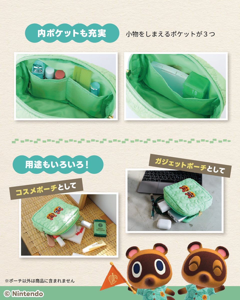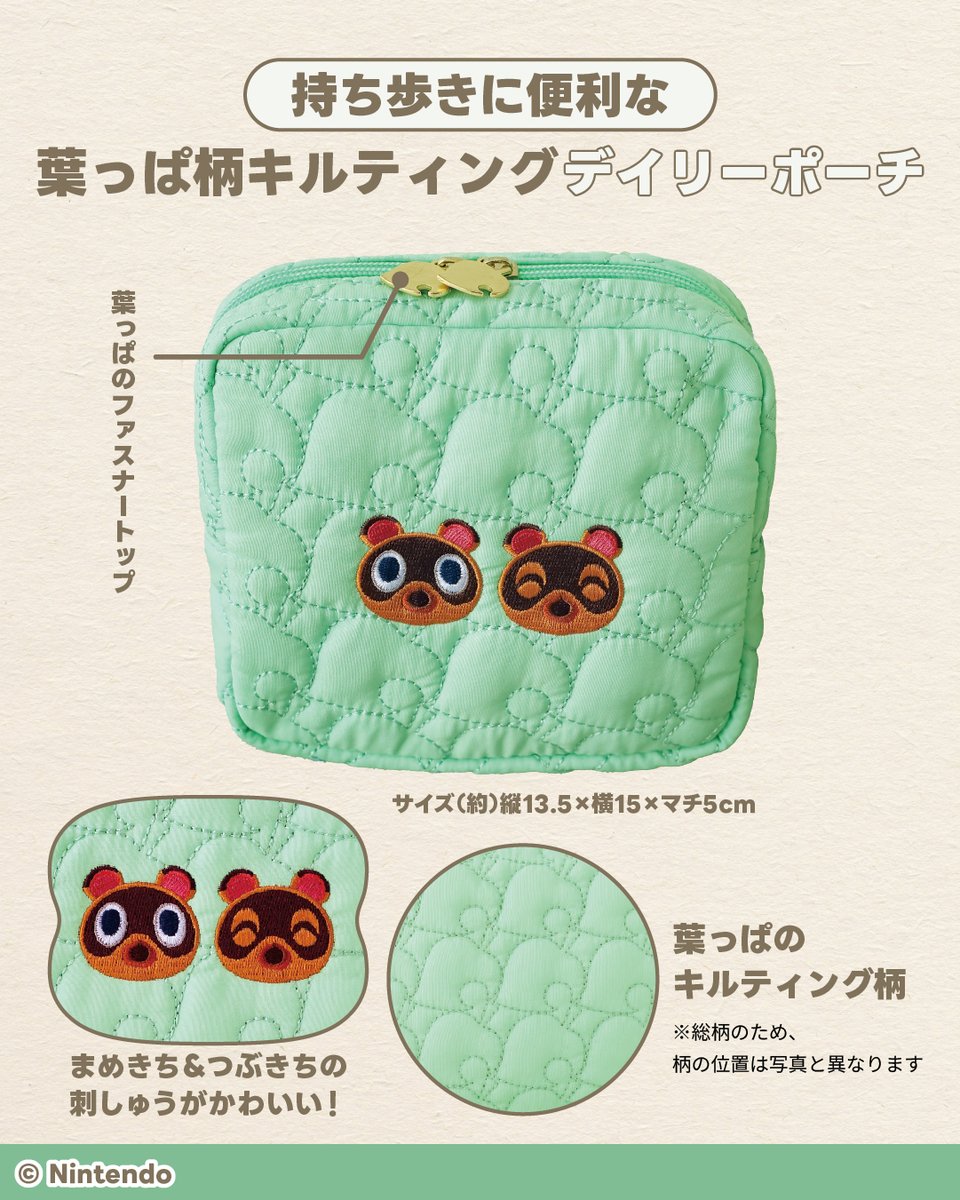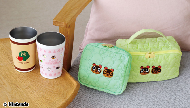 任天堂の『あつまれ どうぶつの森』の『喫茶ハトの巣』『さくら』モチーフの真空断熱タンブラーと、『まめきち&つぶきち』が刺しゅうされた葉っぱ柄キルティングポーチが2種登場