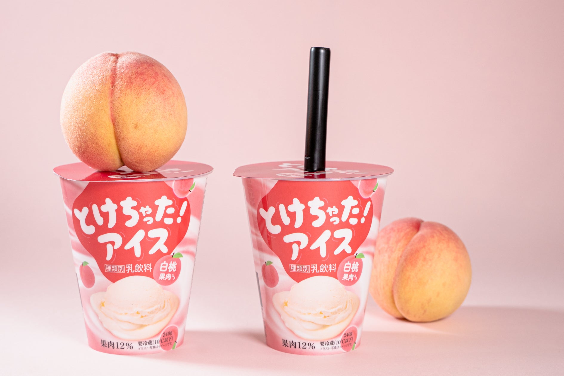 とけちゃった!アイス 白桃果肉入りは、アイスを溶かしたようなミルクの味わいと白桃果肉を楽しめるというデザート飲料。