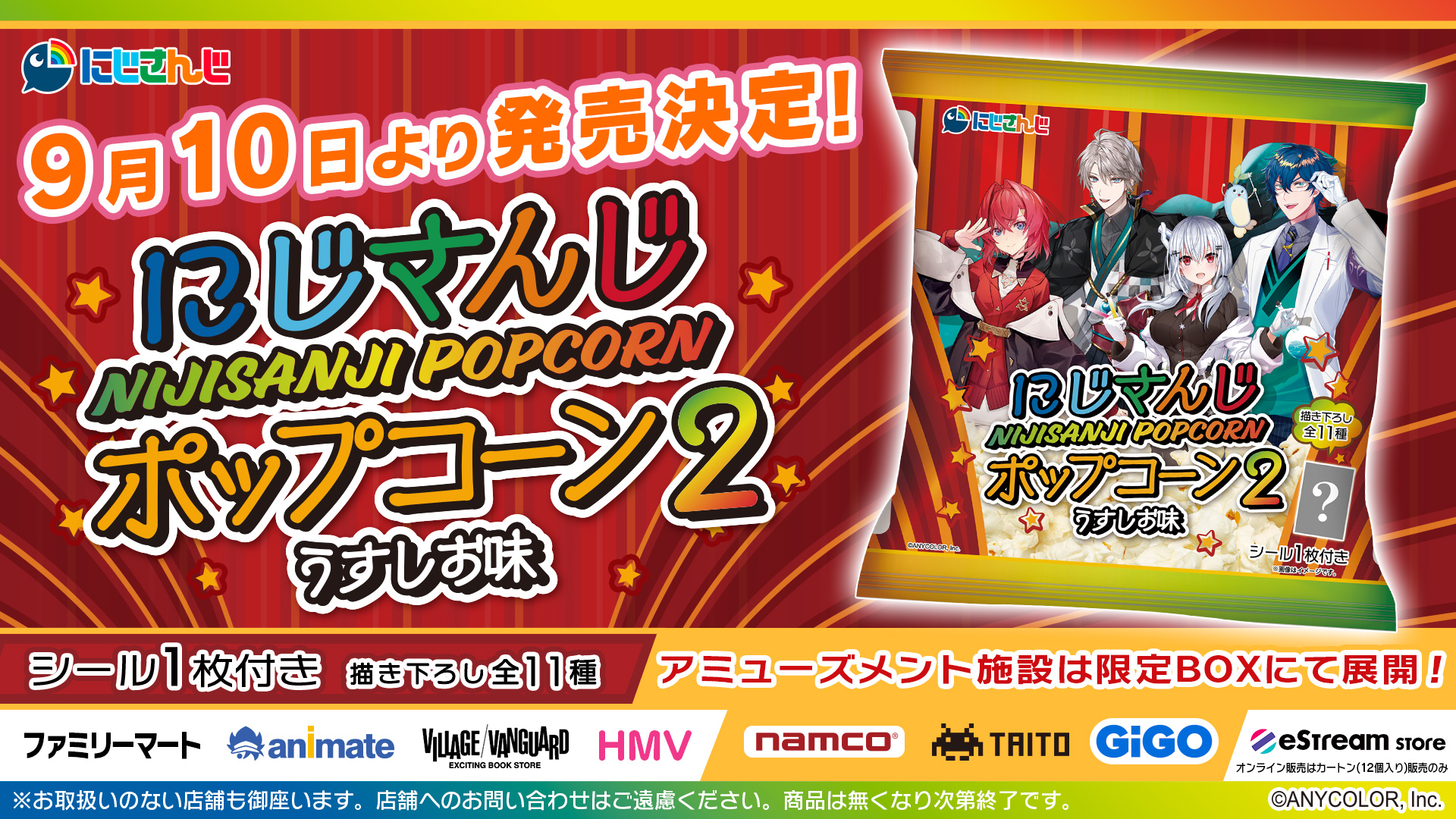 「にじさんじポップコーン」は、にじさんじのメンバーがパッケージやオマケに登場する、シール付きのポップコーン。ポップコーンの味はうすしお。