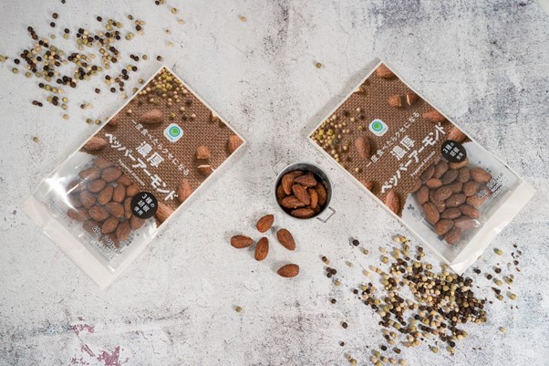 一度食べたらクセになる濃厚ペッパーアーモンドは、3種類の胡椒(ブラックペッパー、ホワイトペッパー、グリーンペッパー)と岩塩を使用し、スパイシーかつ濃厚に味付けをしたというアーモンド。