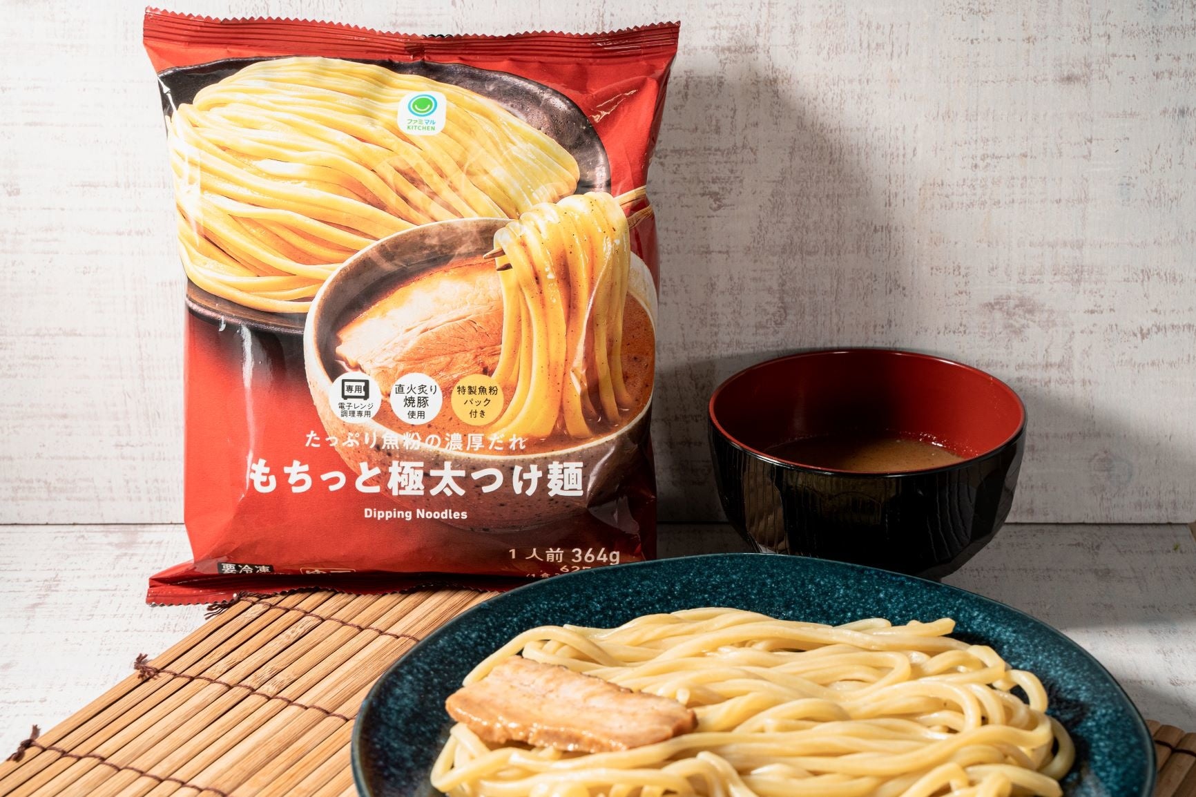 極太でもっちり食感の麺と魚介豚骨醤油のつけだれがウリの冷凍つけ麺