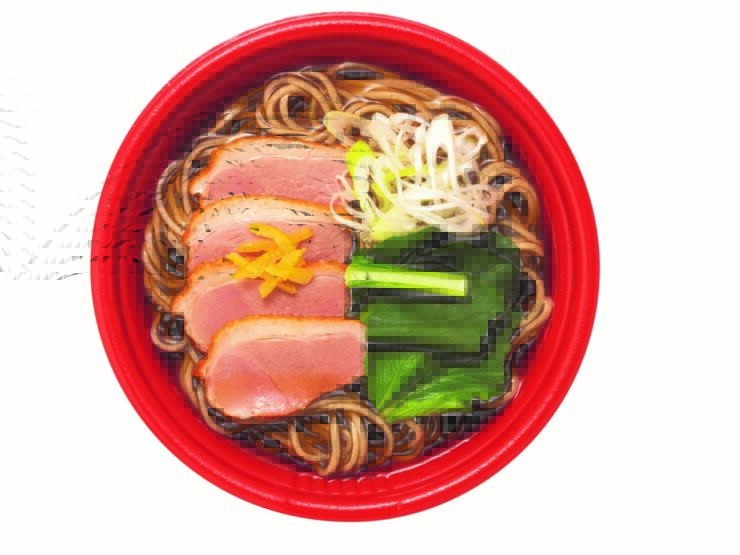 国産の大豆と小麦を使ったまろやかな風味が特徴の「キッコーゴ丸大豆醤油」を使用したつゆを採用したそば。燻製したあい鴨と香りづけのために柚子皮がのせられています。具材として東京産の小松菜を使用しているとのこと(天候によって小松菜の産地が、変更になる場合あり)。