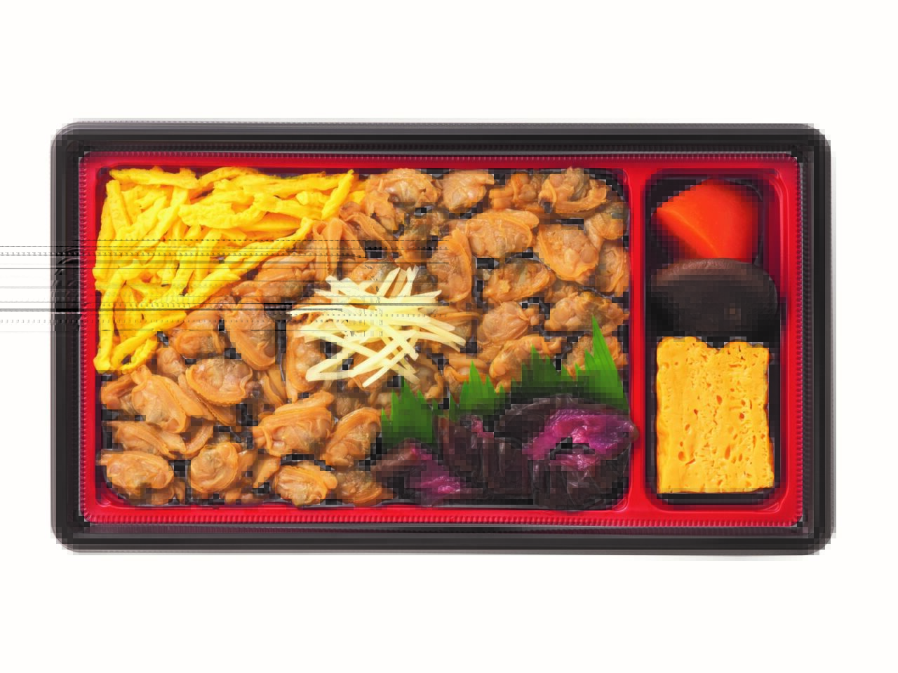 キッコーゴ丸大豆醤油を使用して煮たあさりを盛り付けたお弁当。ご飯はあさりとかつおの旨味が効いているそうです。また、付け合わせの煮物にもキッコーゴ丸大豆醤油が使用されているとのこと(全体のうち98%使用)。
