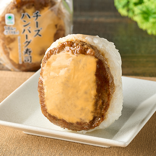 チーズハンバーグ寿司は、スライスチーズをトッピングしたハンバーグをご飯の上にのせたお寿司。ハンバーグはてりやきのタレなどで味付けされているそうです。
