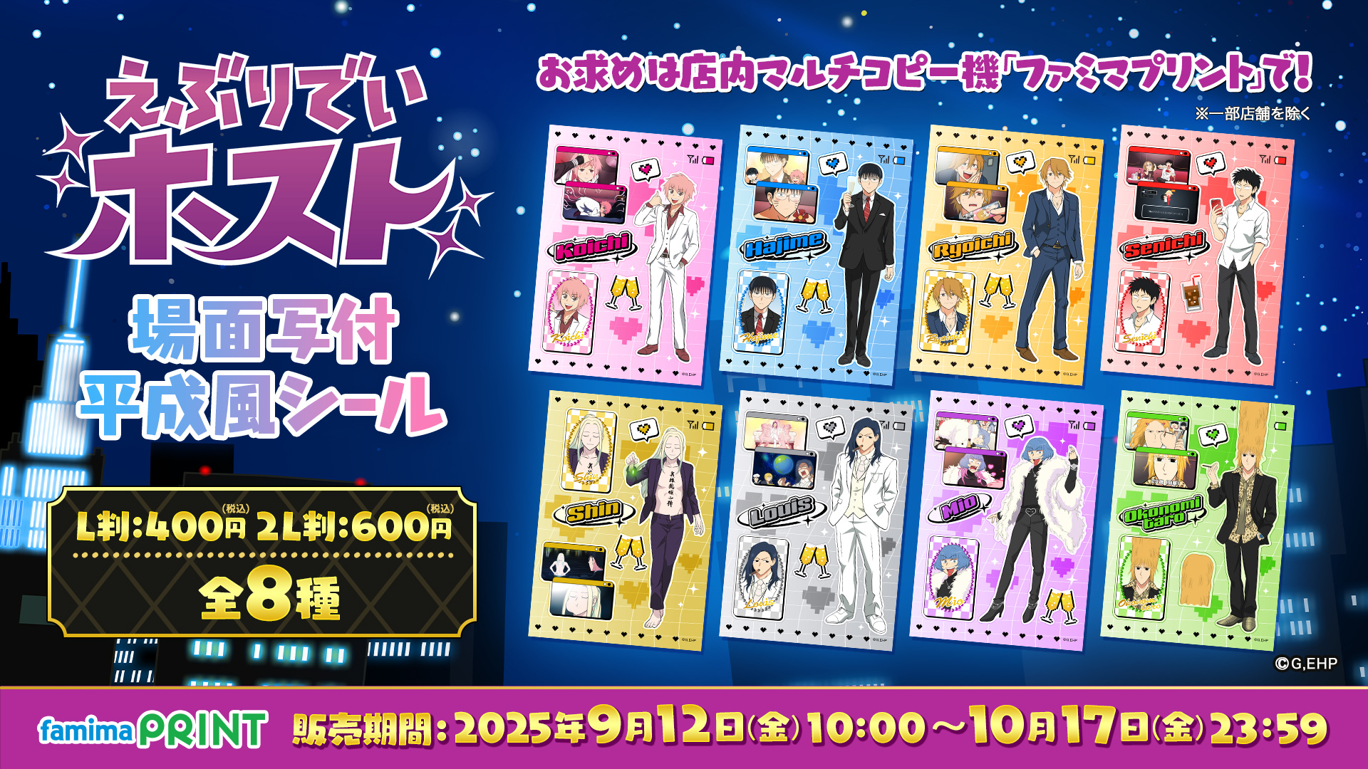 ファミマプリントで「えぶりでいホスト 場面写付き平成風シール」が2025年9月12日(金) 10:00から販売が開始されます。販売期間は10月17日(金) 23:59まで。