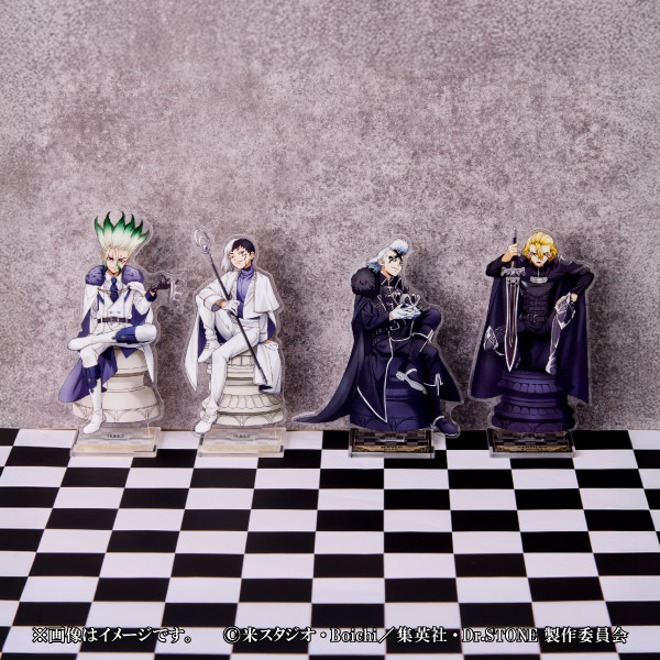 石神千空たち4人が「チェス」をテーマにした衣装で登場し、アクスタは全4種類、缶バッジは全2種類がラインアップされます。