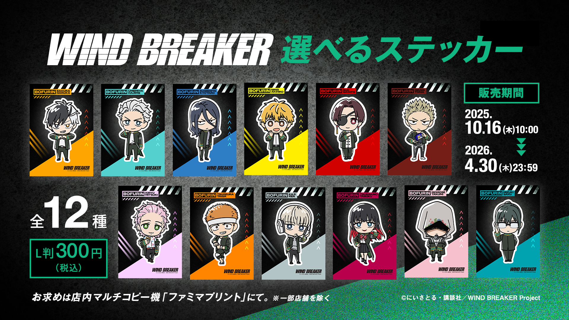 ファミマプリントで「WIND BREAKER SDキャラステッカー」が2025年10月16日(木) 10:00から販売が始まっています。販売期間は2026年4月30日(木) 23:59まで。
