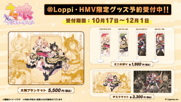 「大判ブランケット」は秋公演のキービジュアル、「ミニのぼり」「デスクマット」は秋公演と春公演のキービジュアルを使用し、フサイチパンドラ、ステイゴールド、ジェンティルドンナ、オルフェーヴルの4名が登場。