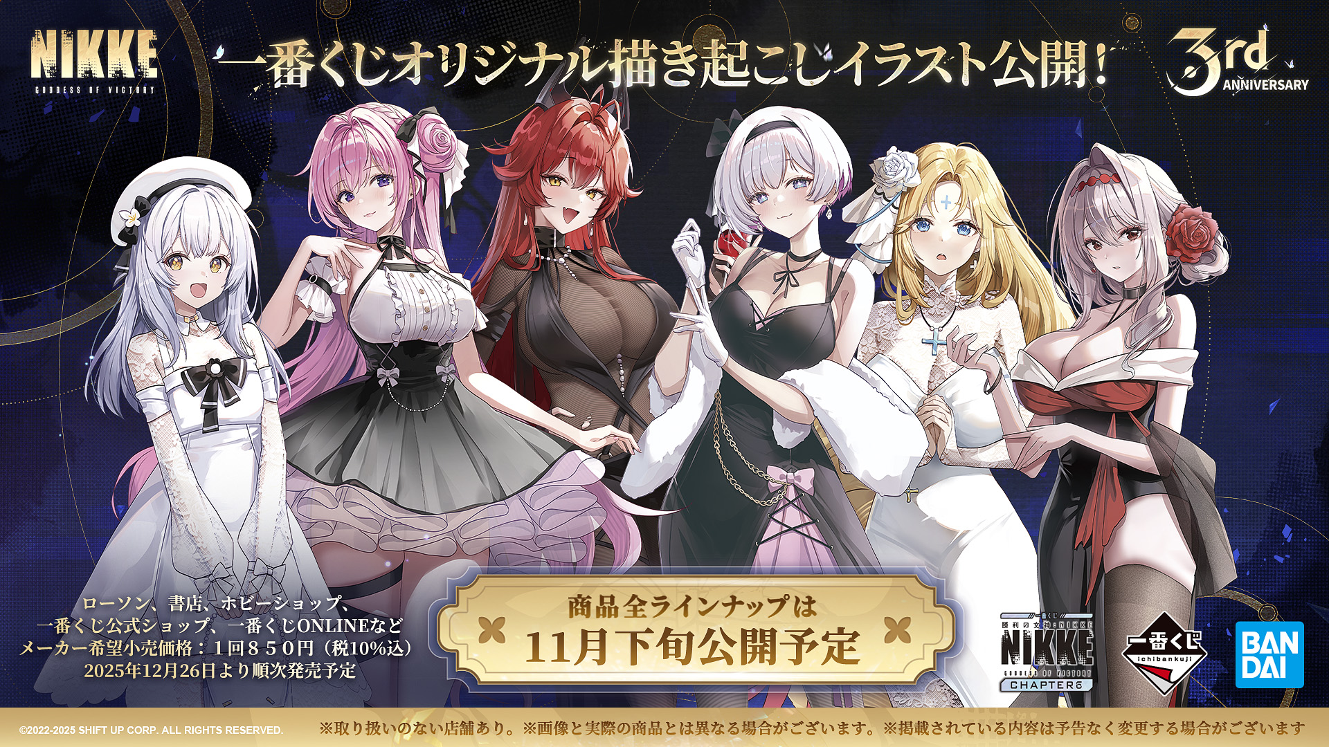 「一番くじ 勝利の女神:NIKKE CHAPTER6」(NIKKE一番くじ第6弾)が2025年12月26日(金)に発売が予定されています。価格は850円(税込)、取り扱い店舗はローソン、書店、ホビーショップ、一番くじ公式ショップ、一番くじONLINEなど。