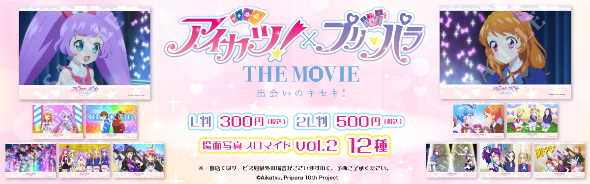 映画『アイカツ!×プリパラ THE MOVIE – 出会いのキセキ! -』の場面写真を使用したブロマイドの第2弾で、全12種類がラインアップ。全12種の中から好きなシーンを選んで購入できます。