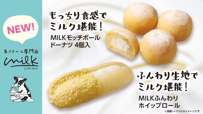 生クリーム専門店「Milk」(ミルク)とコンビニのローソンが再びコラボレーション、Milkコラボ商品「MILKモッチボールドーナツ 4個入」「MILKふんわりホイップロール」が2025年11月11日(火)から販売が開始されます。価格は順に192円(税込)、171円(税込)。