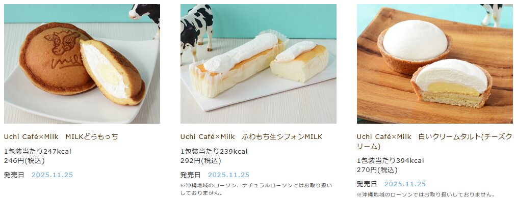 全国のローソンでMilkコラボ商品「ふわもち生シフォンMILK」「白いクリームタルト(チーズクリーム)」が2025年11月25日(火)から販売が開始されるようです。また、「MILKどらもっち」も同日より再登場します。