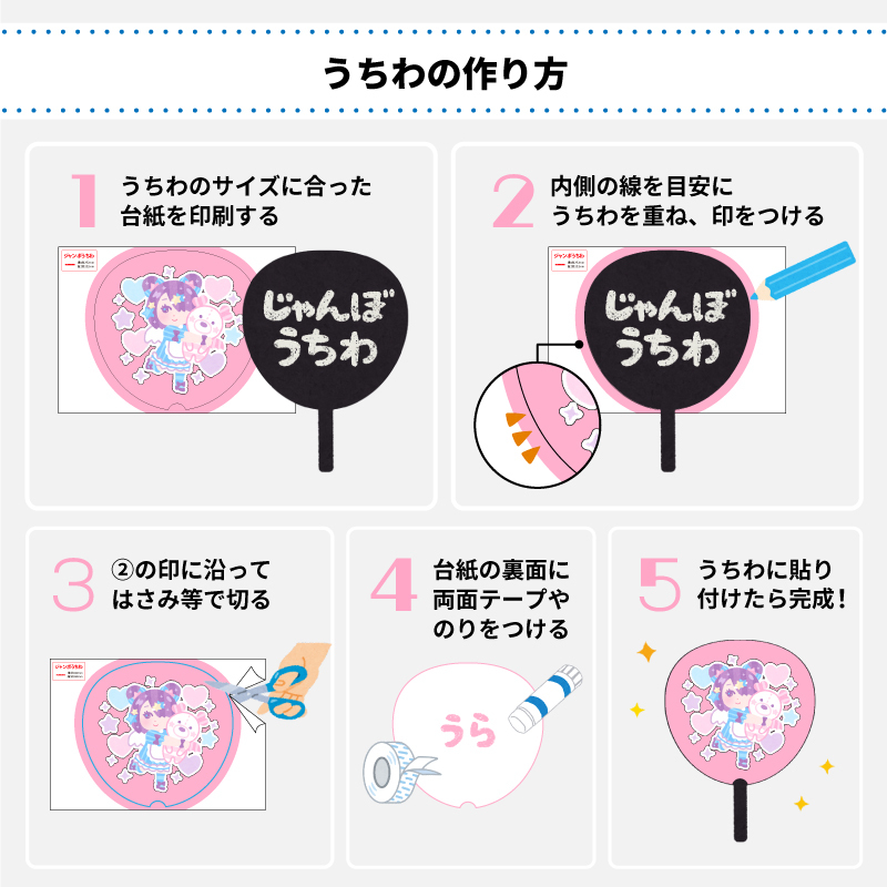 うちわのデザインはコーイチやハジメ達キャラクターがデザインされた「表」が9種、ファンサをもらうためのアピールが書かれた「裏」が9種の計18種類が用意され、それぞれ好きなデザインを選んで購入可能。