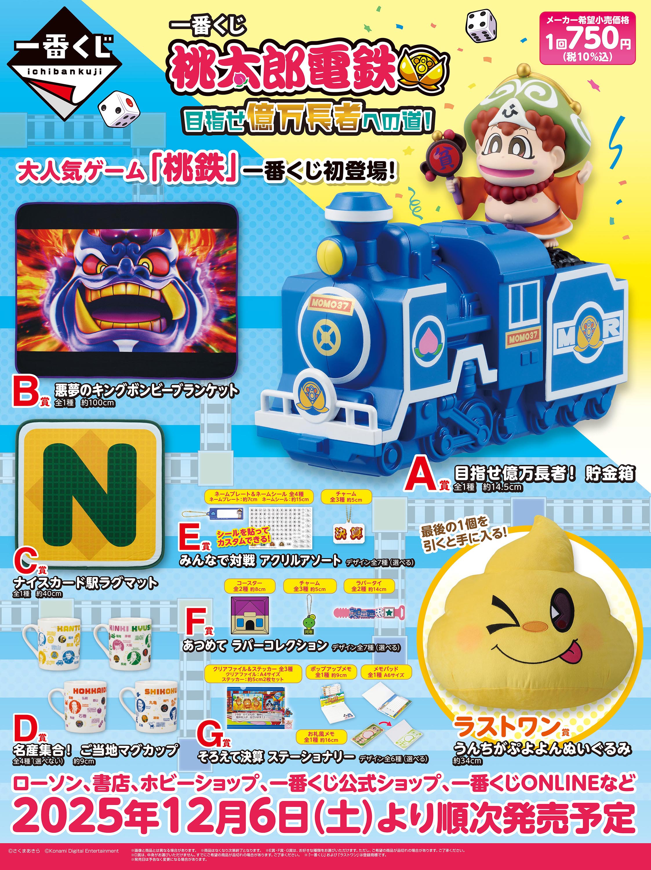 ローソンで「一番くじ 桃太郎電鉄 目指せ億万長者への道!」が2025年12月6日発売、桃鉄の世界観を楽しめる『目指せ億万長者! 貯金箱』『悪夢のキングボンビーブランケット』が当たる! ラストワン賞は『うんちがぷよよんぬいぐるみ』