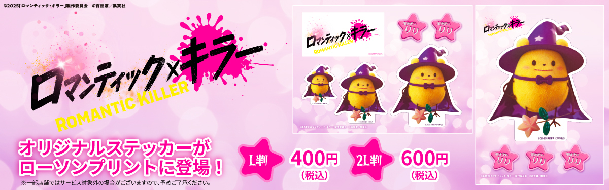 ローソンプリントで「映画『ロマンティック・キラー』オリジナルステッカー」が2025年12月9日(火)から販売が始まっています。販売期間は2026年3月31日(火) 23:59まで。