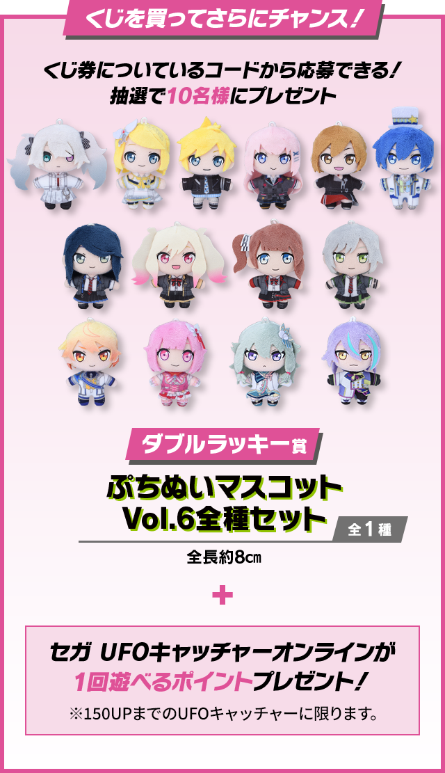 また、くじ券についているコードから応募することで、B賞の『ぷちぬいマスコット』全14種類がセットになった「ぷちぬいマスコット Vol.6全種セット」+「セガ UFOキャッチャーオンライン 1回遊べるポイント(※150PまでのUFOキャッチャーに限る)」が抽選で10名に当たるWラッキー賞キャンペーンも実施予定とのこと。