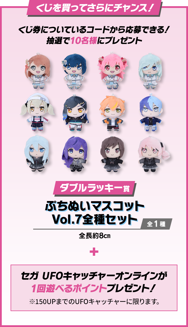 また、くじ券についているコードから応募することで、B賞の『ぷちぬいマスコット』全12種類がセットになった「ぷちぬいマスコット Vol.7全種セット」+「セガ UFOキャッチャーオンライン 1回遊べるポイント(※150PまでのUFOキャッチャーに限る)」が抽選で10名に当たるWラッキー賞キャンペーンも実施予定とのこと。